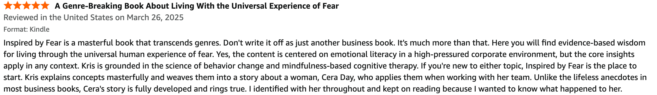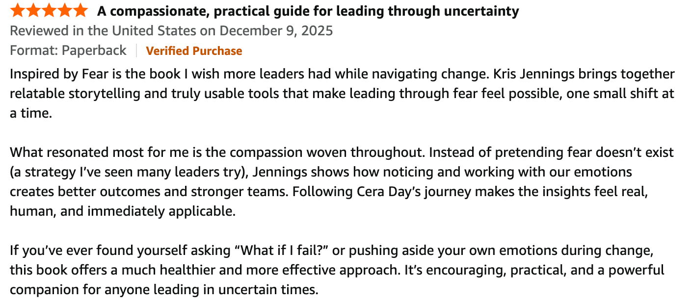 “Inspired by Fear will feel like you are reading your own thoughts and feelings about change management. Kris’ book will provide you with the tools and insight to approach change not only in your work life but your personal life too!”