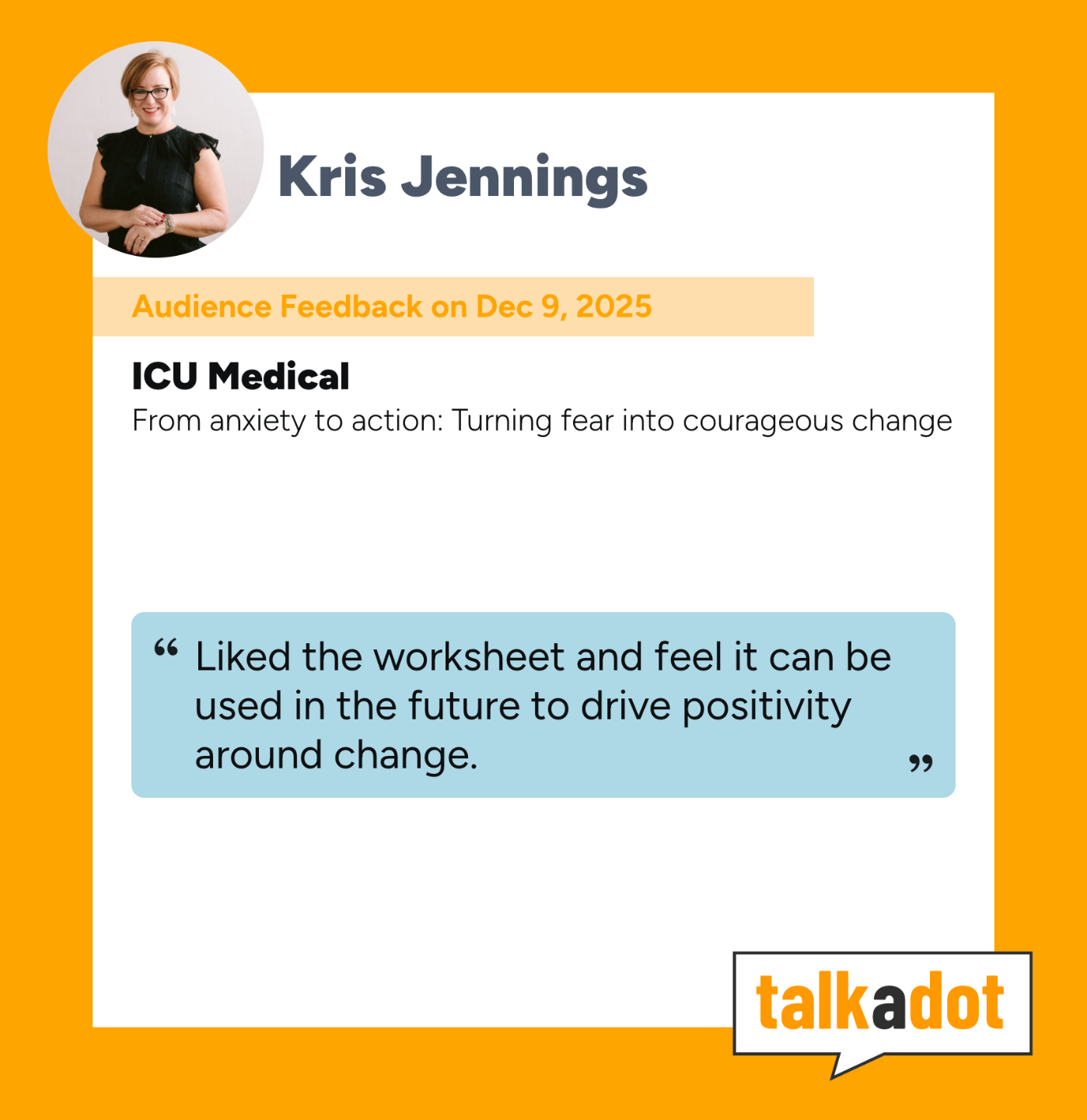 Through virtual and in-person change speaking sessions and action-oriented workshops, I provide leaders, teams, and employees with inspirational ideas and actionable methods to get people unstuck.